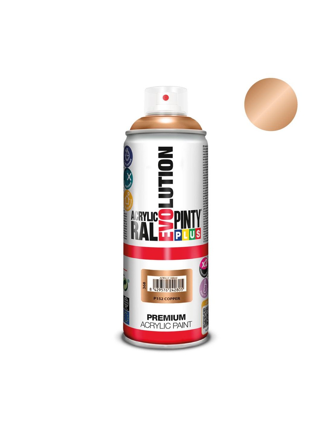 Pintura en spray Pintyplus Evolution acrílica de secado ultrarápido. Para aplicaciones tanto en exteriores como en interiores. Colores sólidos. Garantiza una excelente protección, acabado liso, y uniforme. Se adhiere sobre cualquier superficie: madera, metal, piedra, papel, cartón, plásticos rígidos, etc.