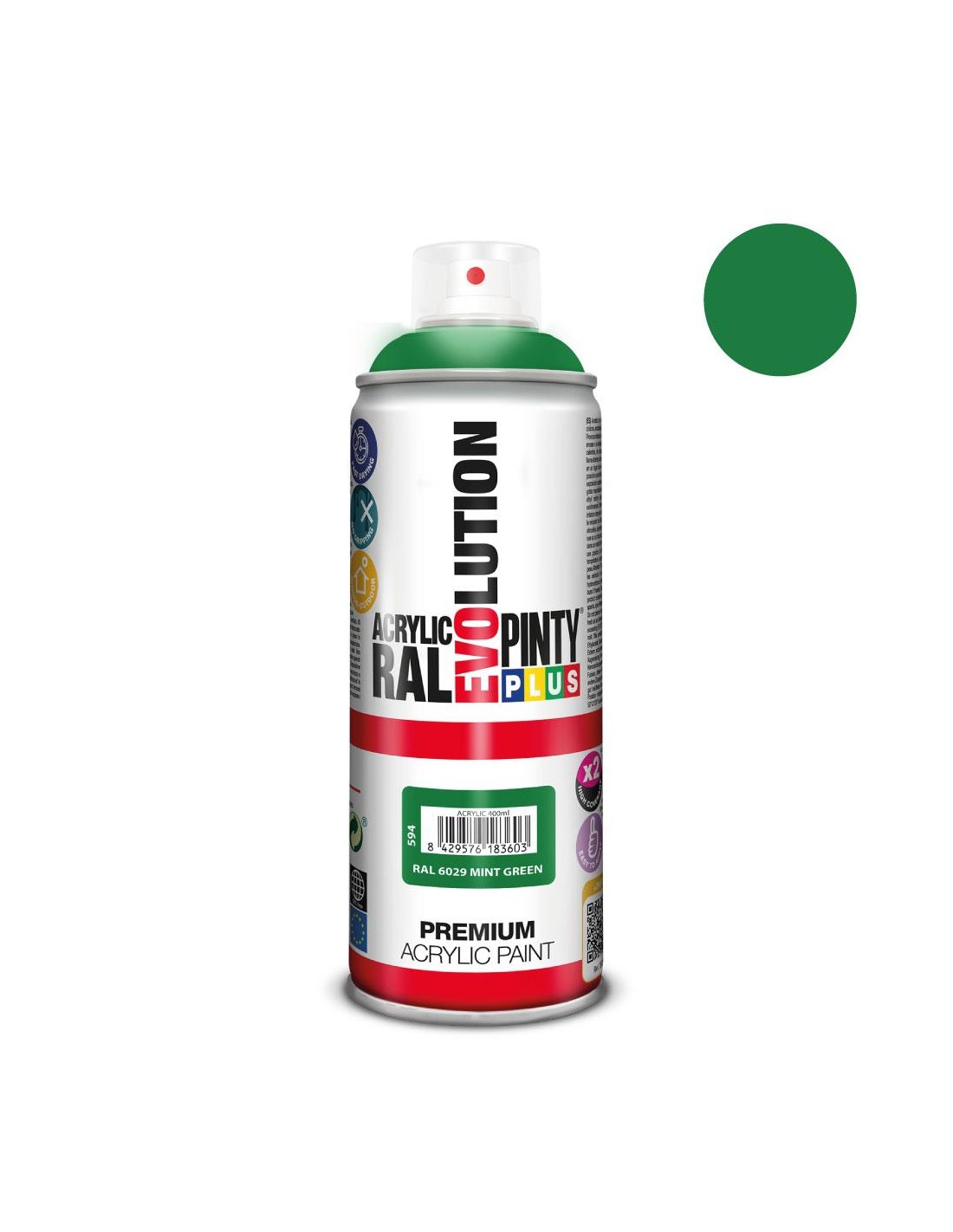 Pintura en spray Pintyplus Evolution acrílica de secado ultrarápido. Para aplicaciones tanto en exteriores como en interiores. Colores sólidos. Garantiza una excelente protección, acabado liso, y uniforme. Se adhiere sobre cualquier superficie: madera, metal, piedra, papel, cartón, plásticos rígidos, etc.