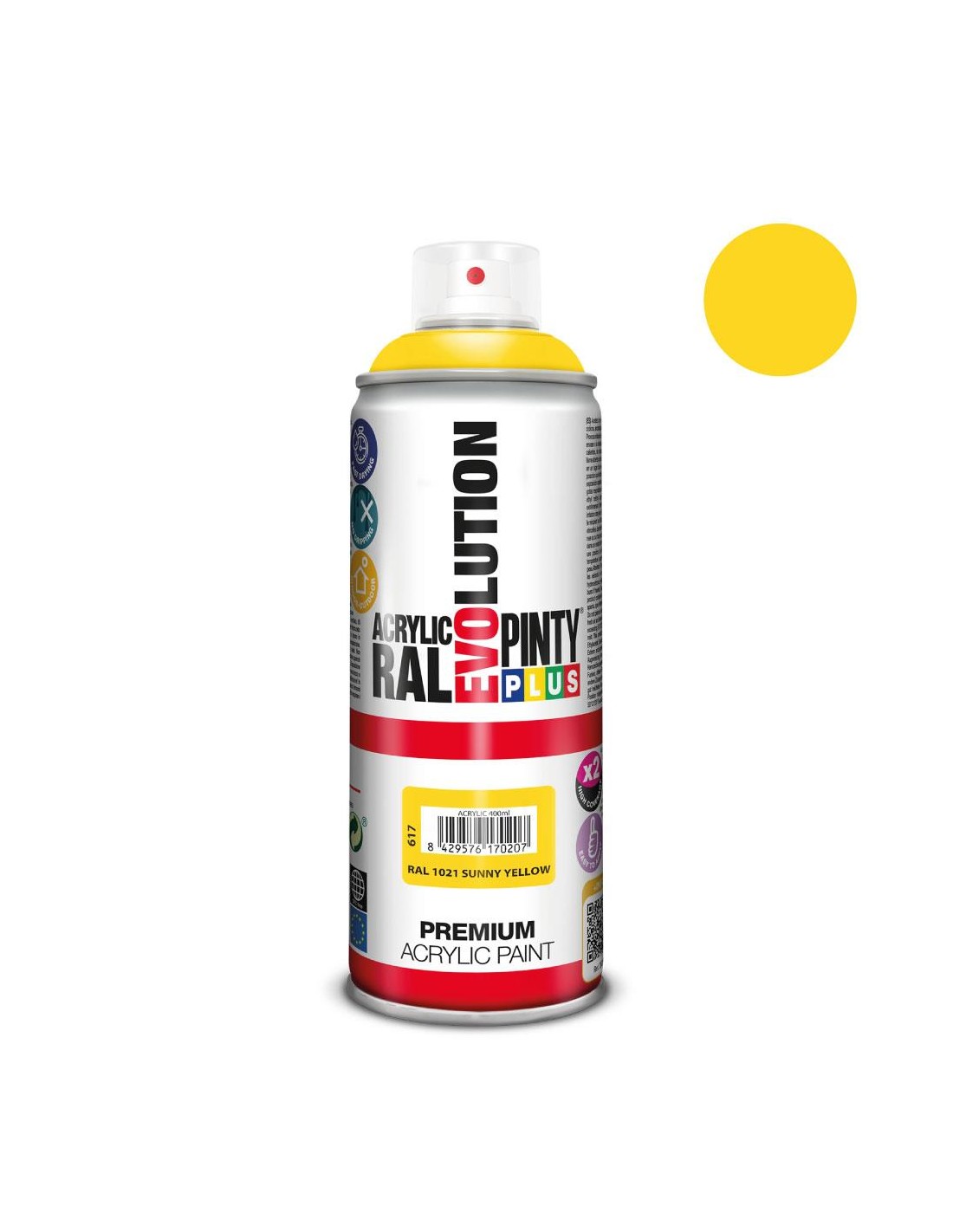 Pintura en spray Pintyplus Evolution acrílica de secado ultrarápido. Para aplicaciones tanto en exteriores como en interiores. Colores sólidos. Garantiza una excelente protección, acabado liso, y uniforme. Se adhiere sobre cualquier superficie: madera, metal, piedra, papel, cartón, plásticos rígidos, etc.
