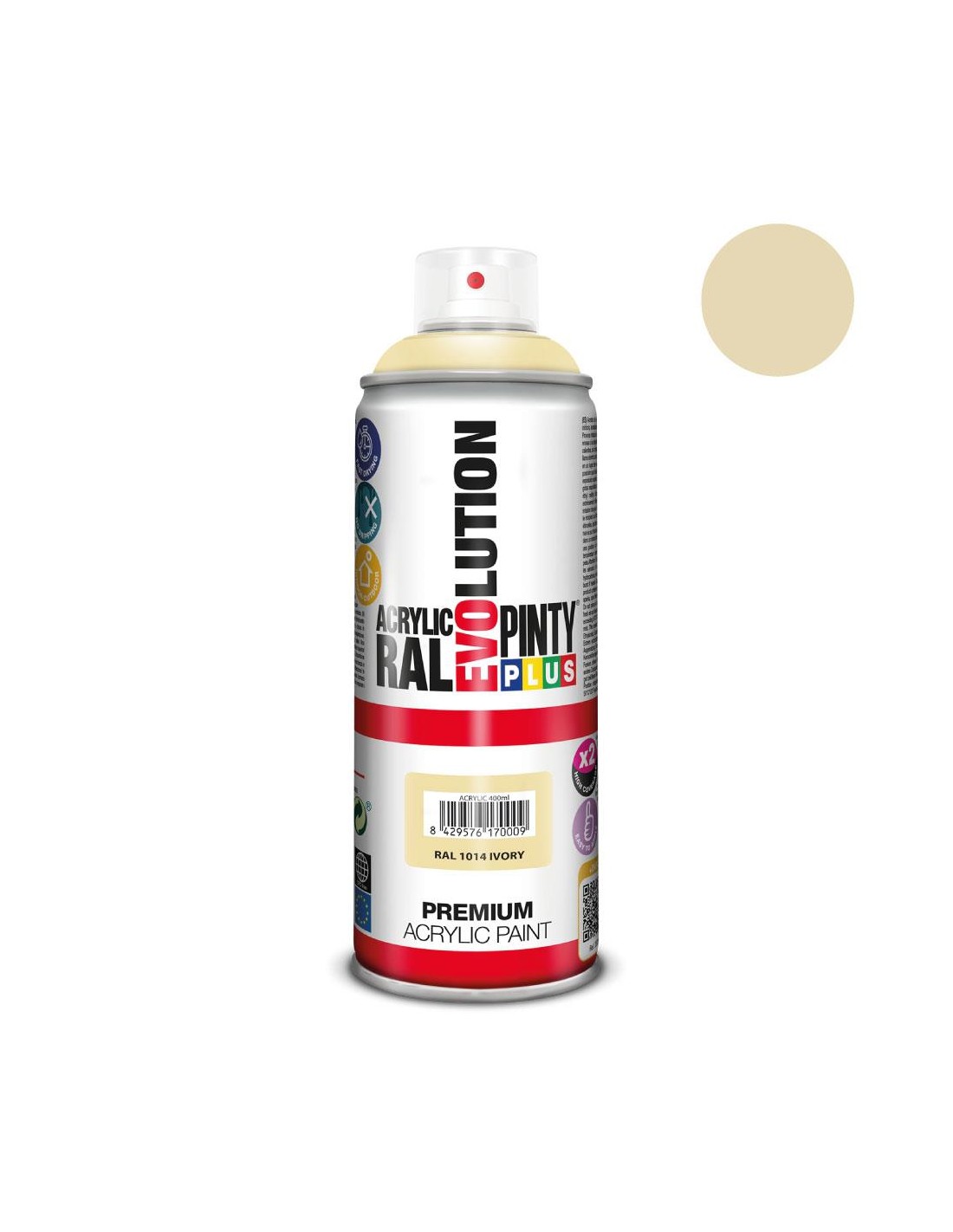 Pintura en spray Pintyplus Evolution acrílica de secado ultrarápido. Para aplicaciones tanto en exteriores como en interiores. Colores sólidos. Garantiza una excelente protección, acabado liso, y uniforme. Se adhiere sobre cualquier superficie: madera, metal, piedra, papel, cartón, plásticos rígidos, etc.