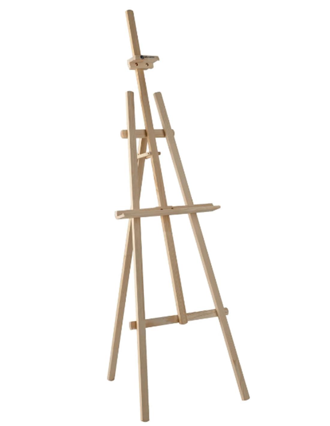 Trípode de estudio estable en madera de pino. El portalienzos es de altura regulable para un óptimo ajuste al trabajar. Provisto de tope para una buena estabilidad del lienzo. Tambíen apto para bastidores 3D. Fácil de plegar.