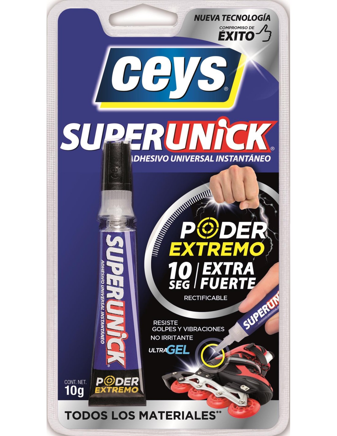 SUPERUNICK es un Adhesivo universal instantáneo de alta prestaciones y acabados perfectos en 10 segundos. FUERTE, RÁPIDO y SEGURO. Pega TODOS LOS MATERIALES*. (No indicado para Polietileno (PE), polipropileno (PP), PTFE). Alta resistencia. Resiste golpes y vibraciones, rectificable (10 segundos) y no pega los dedos.