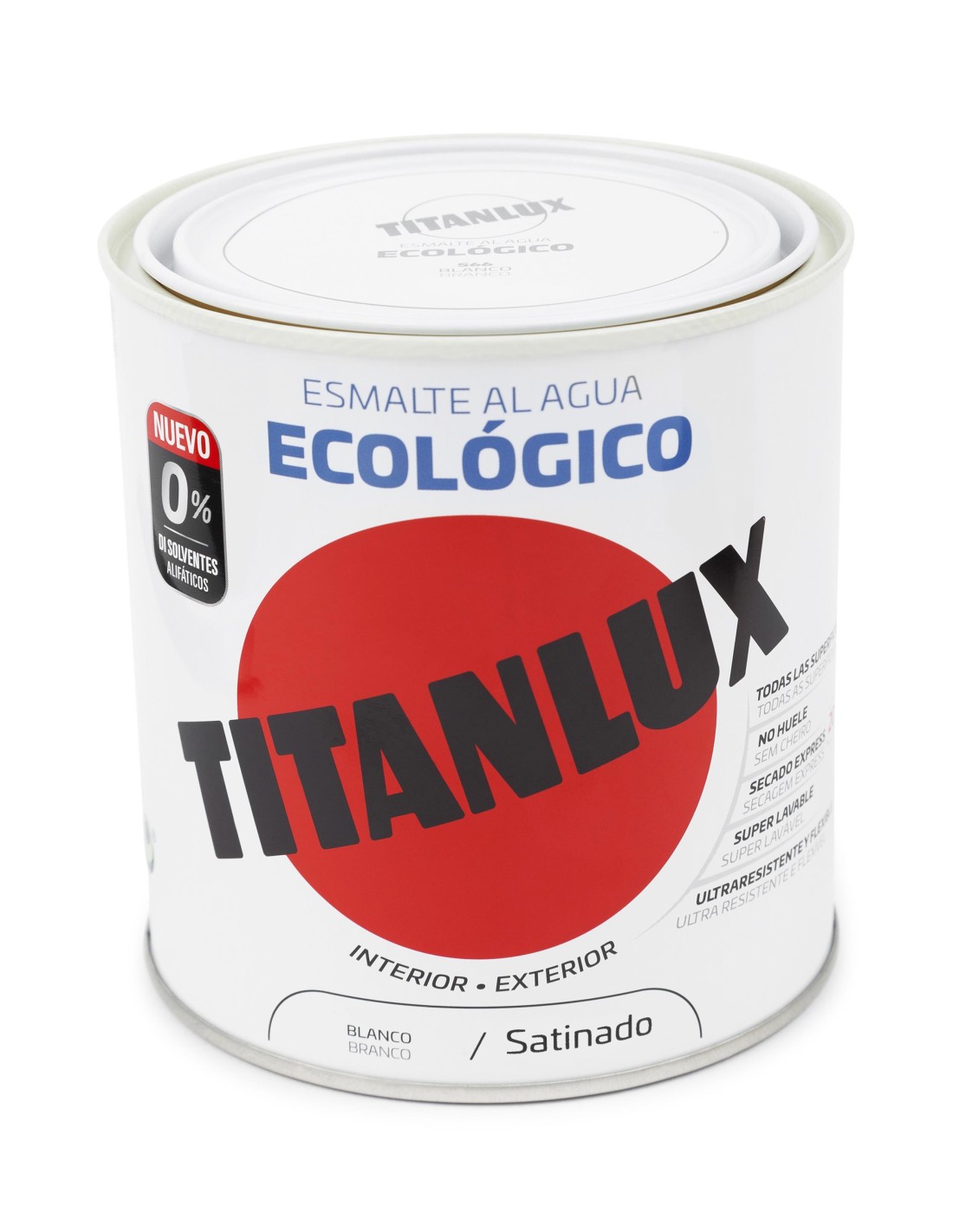 TITANLUX Esmalte Ecológico al Agua SATINADO es un esmalte multi-superficies de alta calidad para interior y exterior. Con una sola capa, decora y protege eficazmente metal, madera, PVC, melamina, cerámica porosa y superficies ya pintadas. Su fórmula con conservante anti-moho ofrece un blanco inalterable que no amarillea, conservando el brillo y la viveza de los colores.