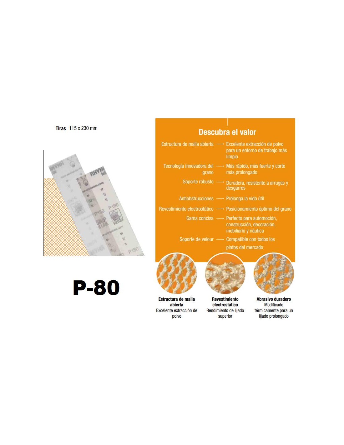 Estructura de malla abierta - Tecnología innovadora del grano -Soporte robusto Antiobstrucciones-Revestimiento electrostático-Gama concisa-Soporte de velour Excelente extracción de polvo para un entorno de trabajo más Limpio Más rápido, más fuerte y corte más prolongado-Duradera, resistente a arrugas y desgarros -Prolonga la vida útil- Posicionamiento óptimo del grano-Perfecto para automoción, construcción, decoración, mobiliario y náutica-Compatible con todos los platos del mercado