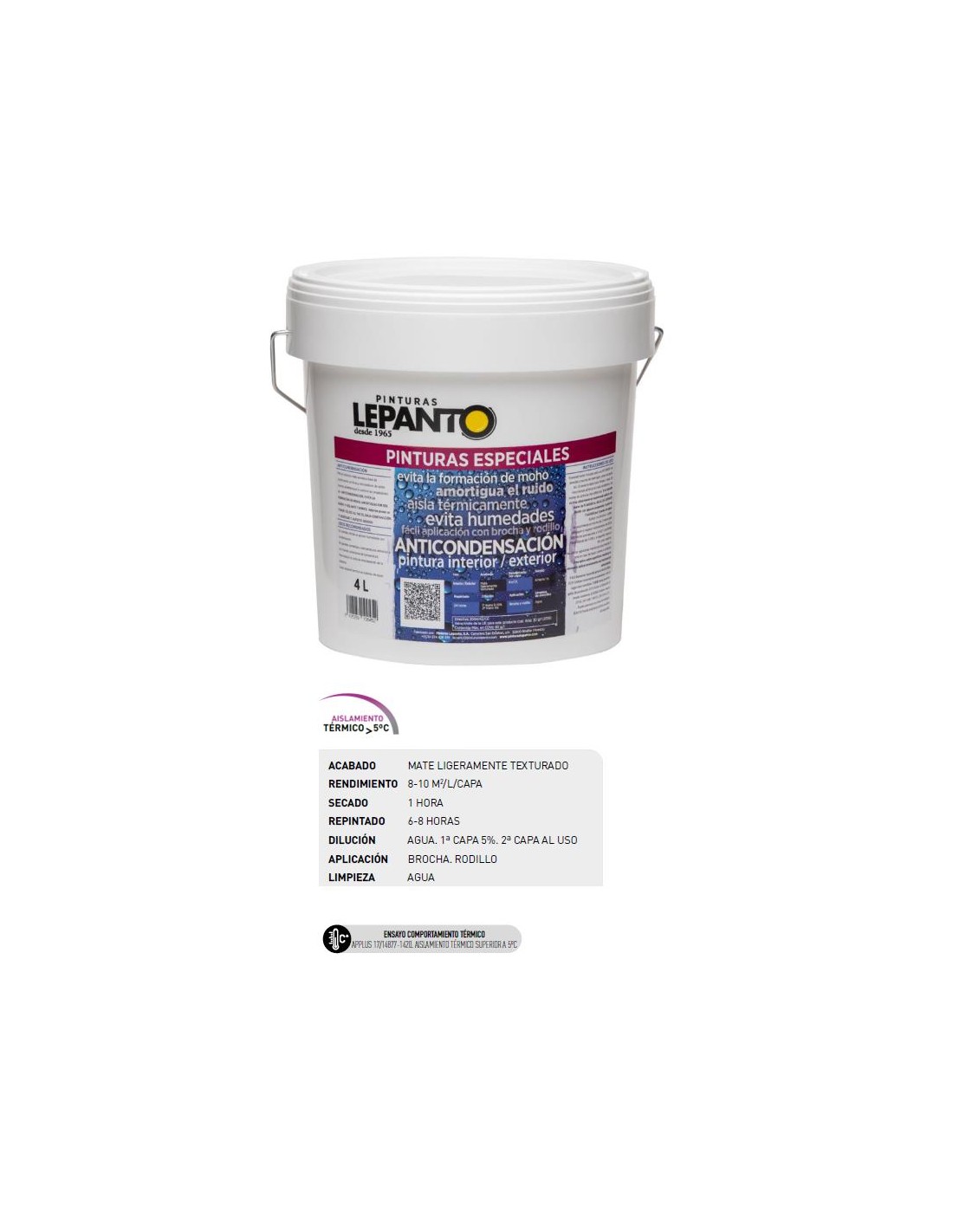 Pintura plástica mate interior-exterior, formulada a base de copolímeros acrílicos y microesferas de vidrio huecas, aislantes e inertes que le confieren sus extraordinarias propiedades.