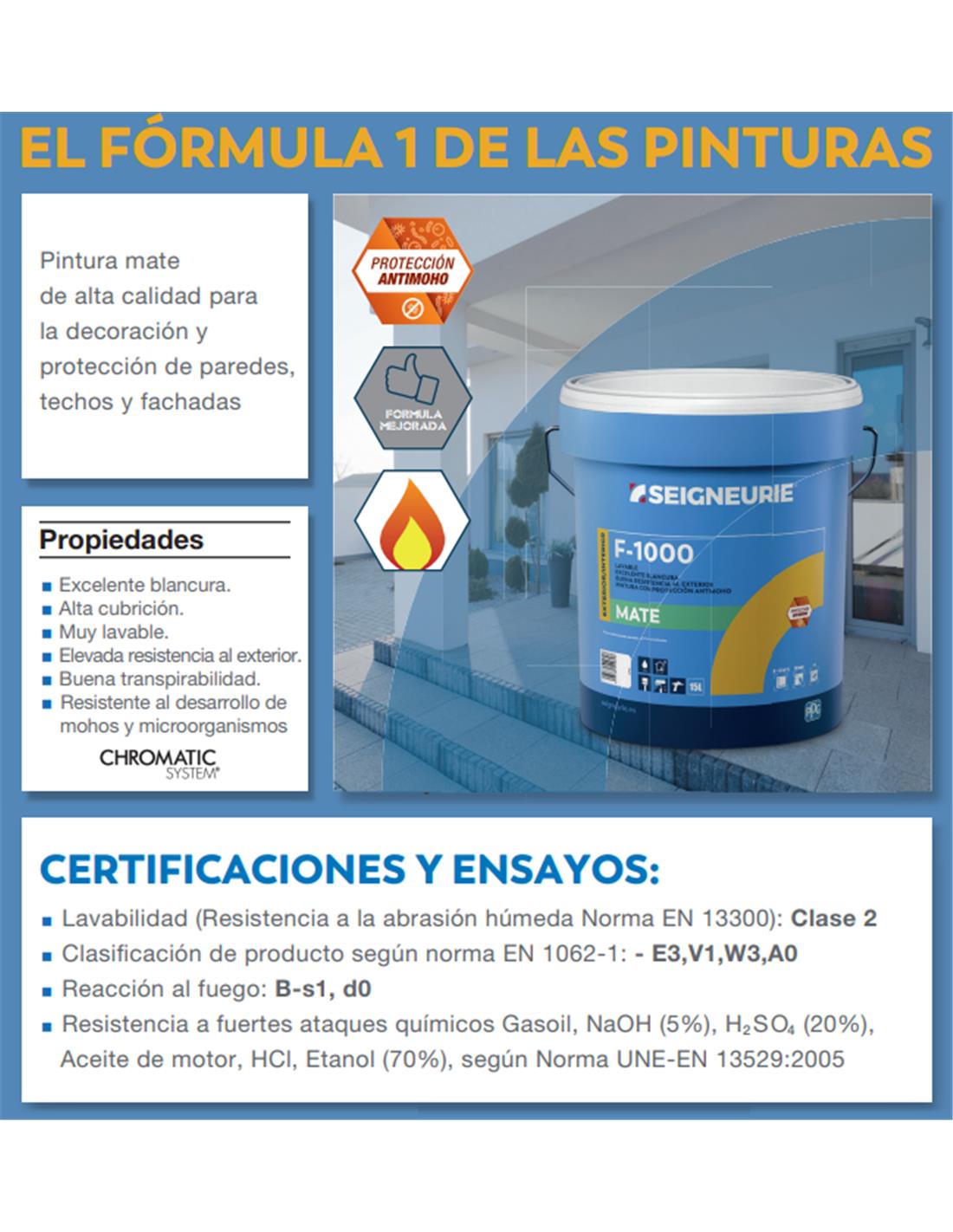 La pintura F-1000 es una solución de alta calidad con copolímeros acrílicos en dispersión acuosa, ideal para la decoración y protección de superficies tanto en interiores como en exteriores. Su acabado mate y liso proporciona un aspecto elegante y uniforme en paredes y techos.