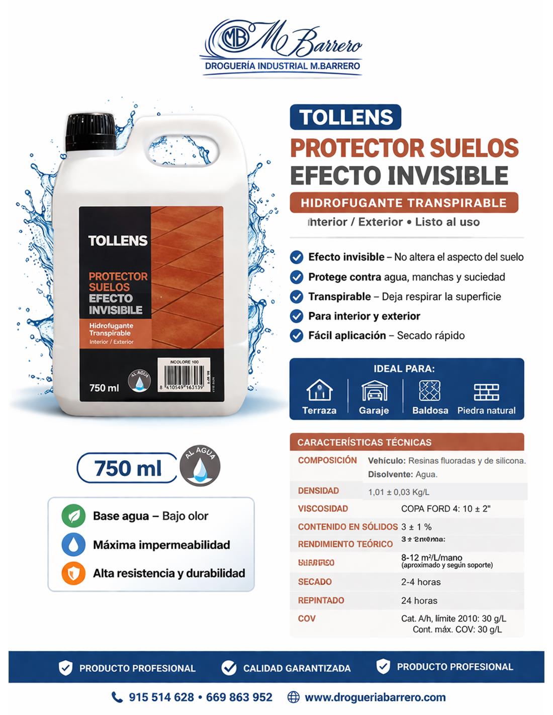 El Protector de Suelos Efecto Invisible de Tollens es la solución definitiva para quienes buscan una protección total contra manchas y humedad sin modificar el aspecto original del material. Su fórmula avanzada penetra profundamente en el soporte sin crear película, garantizando una transpirabilidad máxima y un acabado totalmente natural.
