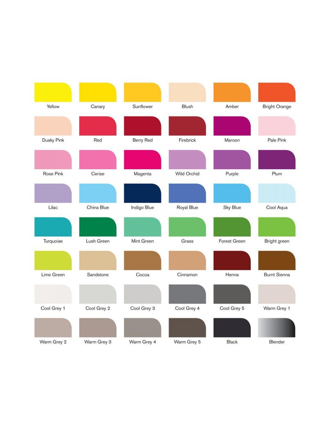 Contiene un Mezclador y 48 x Marcadores: Amarillo • Amarillo Canario • Girasol • Rubor • Ámbar • Naranja Brillante • Rojo • Rojo Cereza • Ladrillo Rojo • Rosa Apagado • Granate • Rosa Pálido • Rosa Fuerte • Cereza • Magenta • Orquídea Salvaje • Morado • Ciruela • Lila • Azul China • Azul Índigo • Azul Real • Azul Cielo • Agua Fresca • Turquesa • Verde Exuberante • Verde Menta • Hierba • Verde Bosque • Verde Brillante • Verde Lima • Piedra Arenisca • Cacao • Canela • Henna • Siena Tostada • Gris Frío 1 • Gris Frío 2 • Gris Frío 3 • Gris Frío 4 • Gris Frío 5 • Gris Cálido 1 • Gris Cálido 2 • Gris Cálido 3 • Gris Cálido 4 • Gris Cálido 5 y Negro.